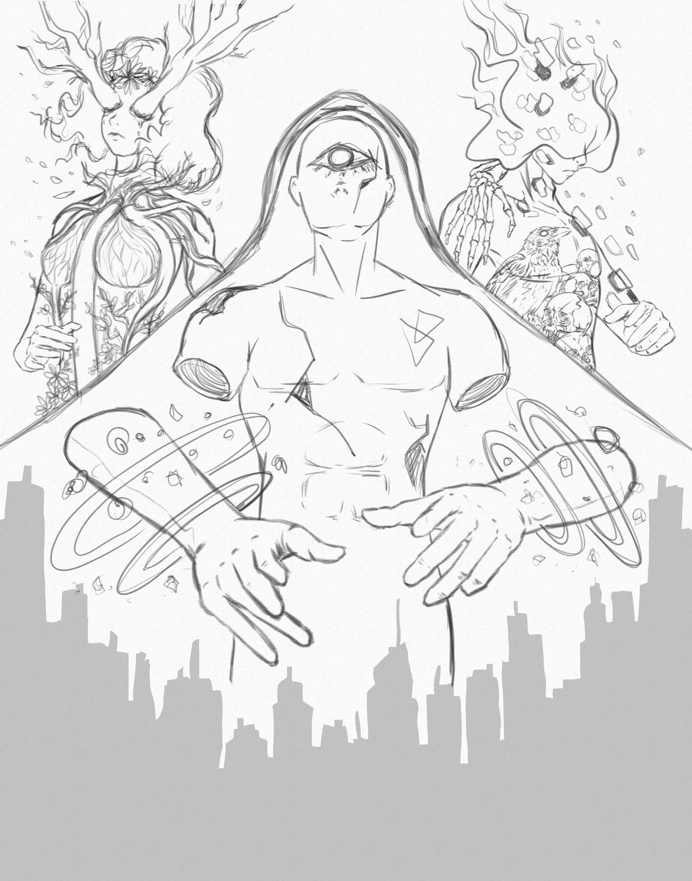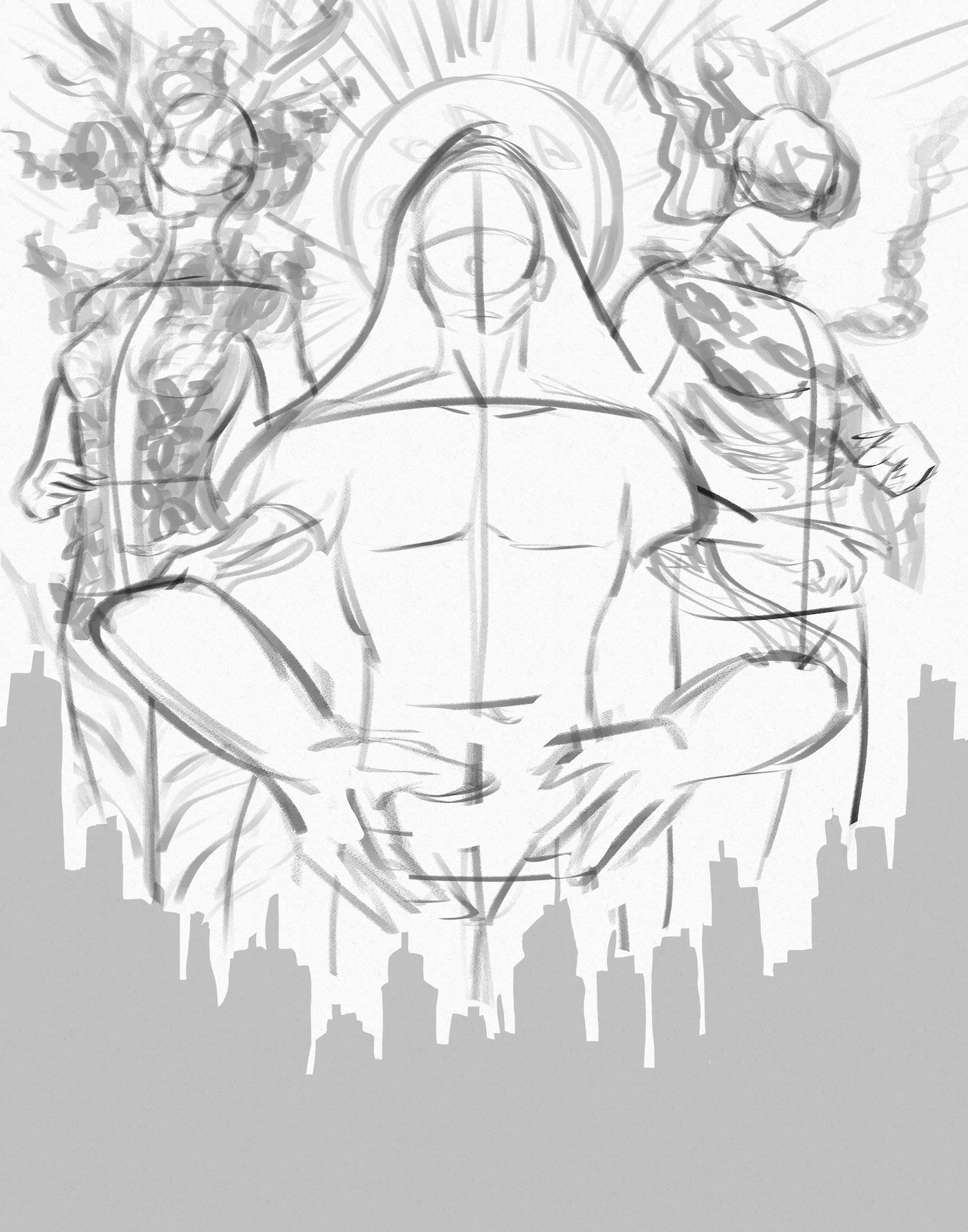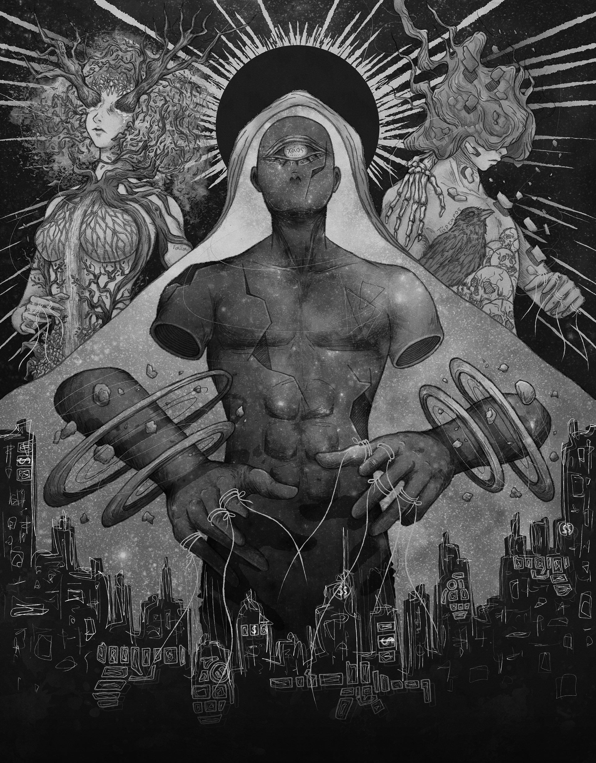 I sought to depict the Greek primordial deities, Chaos, Gaia, and Tartarus, emphasizing how their power over humanity is slowly fading as people become more consumed by money and their own endless wars.