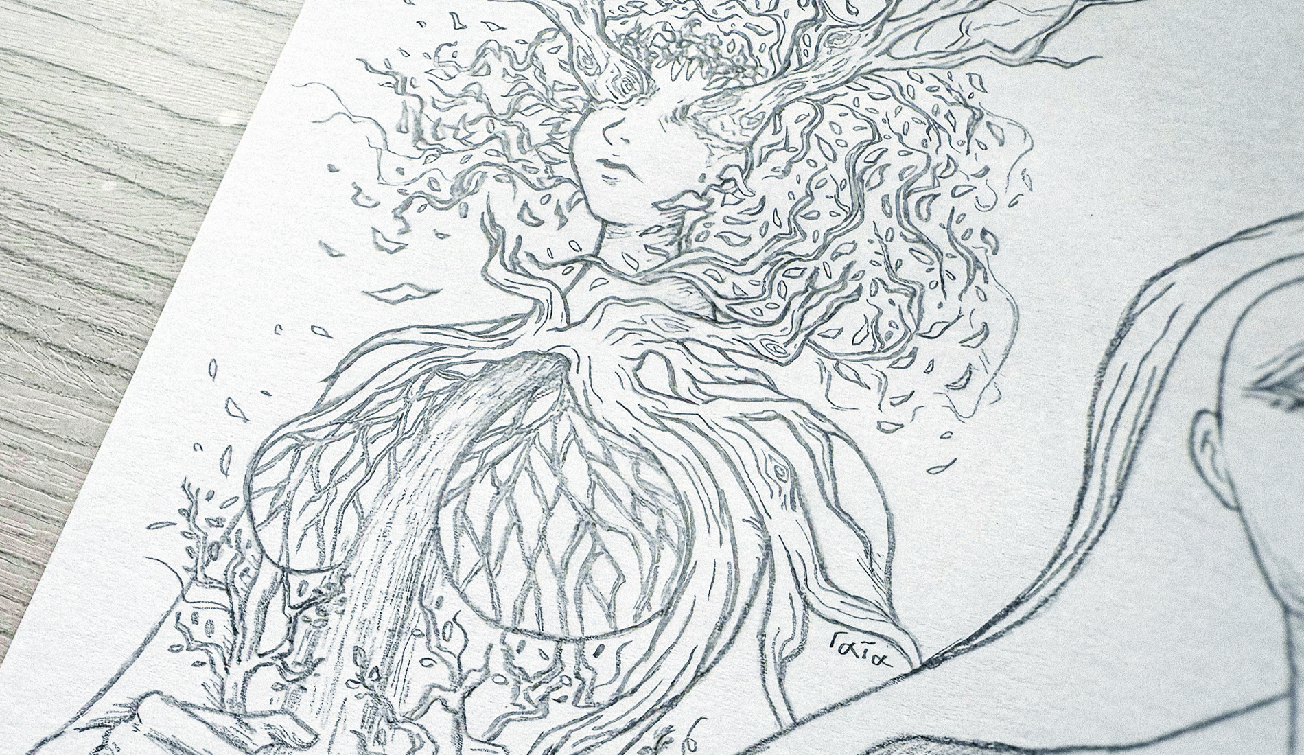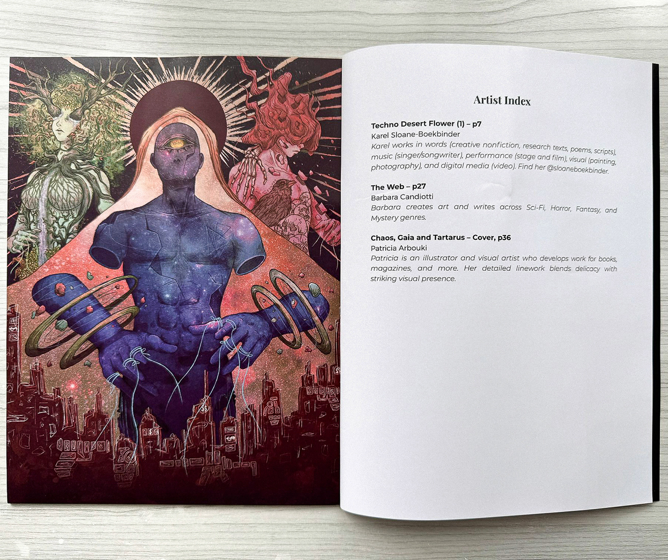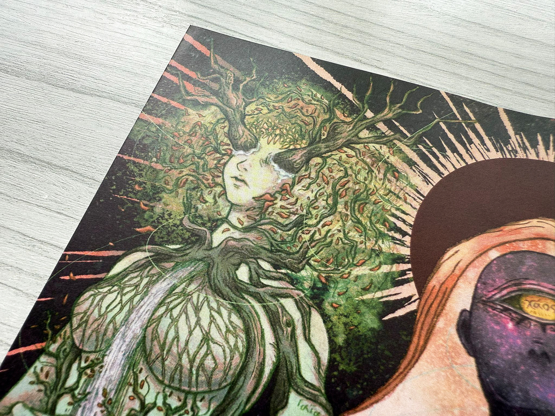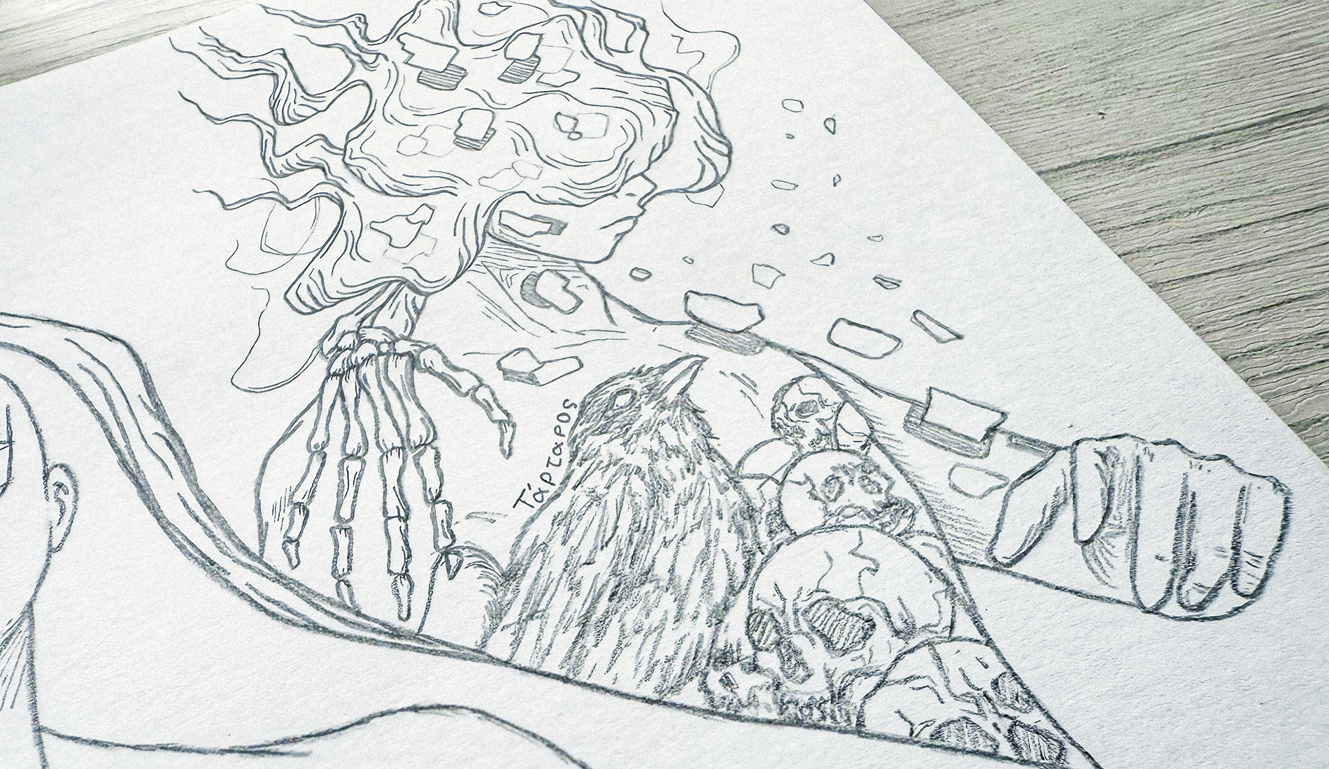 I sought to depict the Greek primordial deities, Chaos, Gaia, and Tartarus, emphasizing how their power over humanity is slowly fading as people become more consumed by money and their own endless wars.